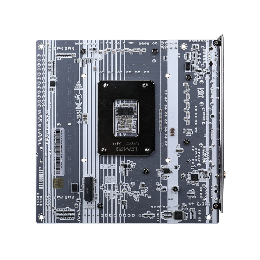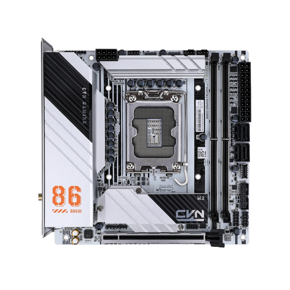 CVN B860I GAMING FROZEN V20 gây ấn tượng mạnh với tone trắng chủ đạo, kết hợp lớp frost heat dissipation armor phủ gần như toàn bộ bề mặt bo mạch. Thiết kế này không chỉ mang lại vẻ ngoài cao cấp, phù hợp với các bản build white build hoặc ITX showcase, mà còn đóng vai trò quan trọng trong việc tăng hiệu quả tản nhiệt cho VRM, SSD và chipset.