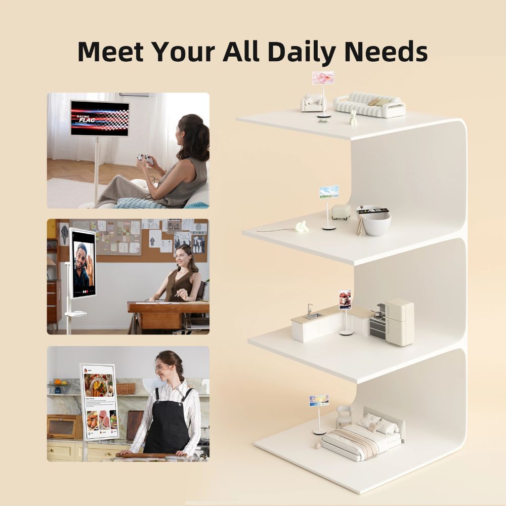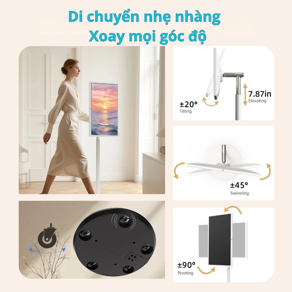 Chiếc TV di động này có thể nghiêng, xoay, xoay dọc hoặc nâng hạ chiều cao tùy thích. Điều khiển dễ dàng qua: